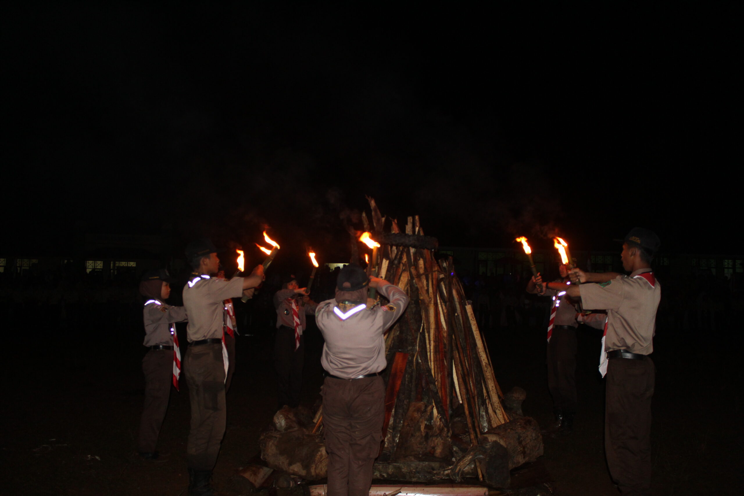 Malamnya, peserta kembali dibariskan melingkar untuk mengikuti upacara Api Dasadarma. Sayangnya, hujan yang mengguyur Bumi Perkemahan Sabtu siang membasahi kayu bakar menyebabkan api sukar menyala. Namun begitu, hal tersebut tidak mengurangi esensi dari api dasadharma sebagai simbol peraturan dasar kepramukaan. “Kayu basah yang tidak bisa menyala meski sudah disiram solar itu sama seperti kita, sebanyak apa pun, mau bagaimana pun orang-orang memberi semangat, tapi jika diri kita tidak memiliki keinginan tidak akan bisa. Jadi, mari manfaatkan moment ini sebagai media pembelajaran untuk kita semua,” tutur Kak Sofyan, pembina upacara Api Dasadarma.